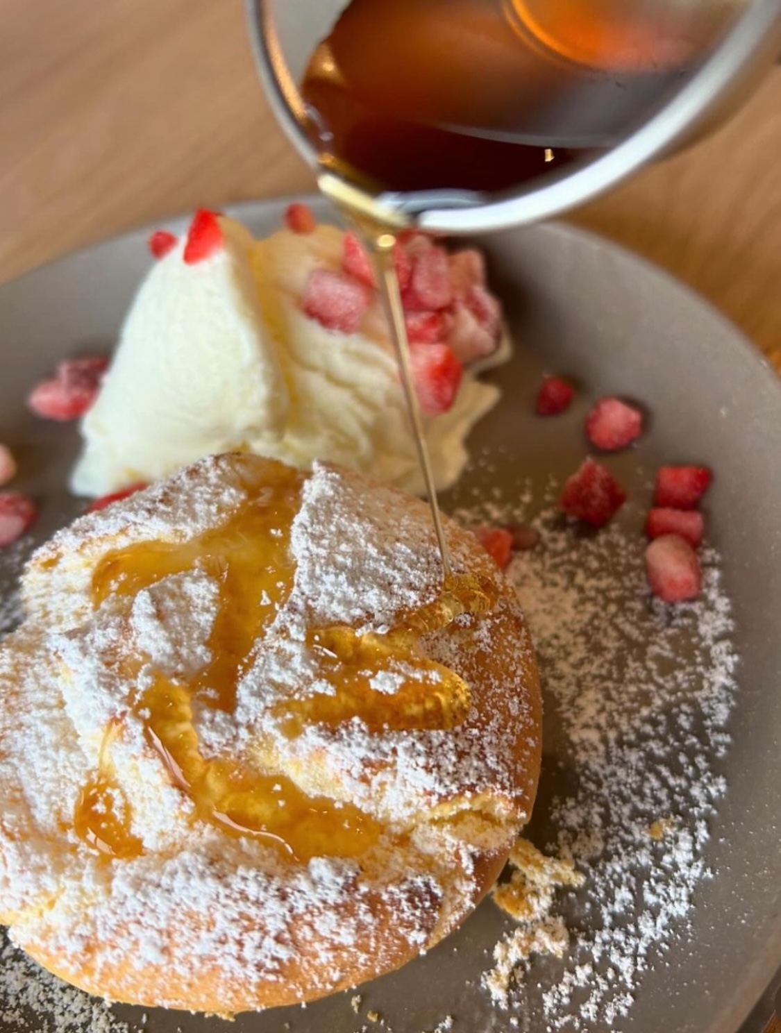クリームチーズの風味がするパンケーキはそのままでも美味しいですが、別添えのバニラアイスと一緒に食べても絶品です。