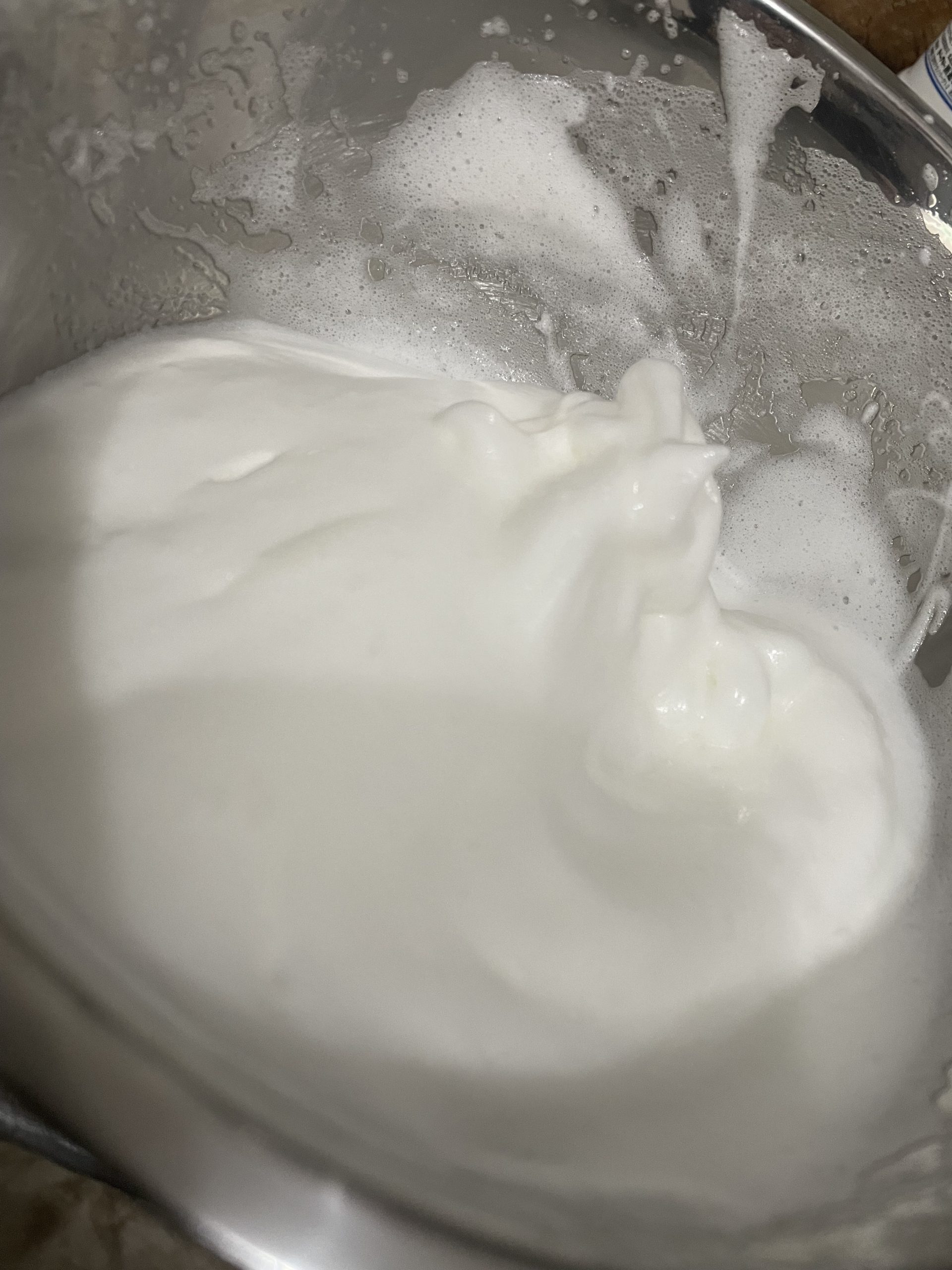 メレンゲを泡立て器で角が立つほどに泡立てます。